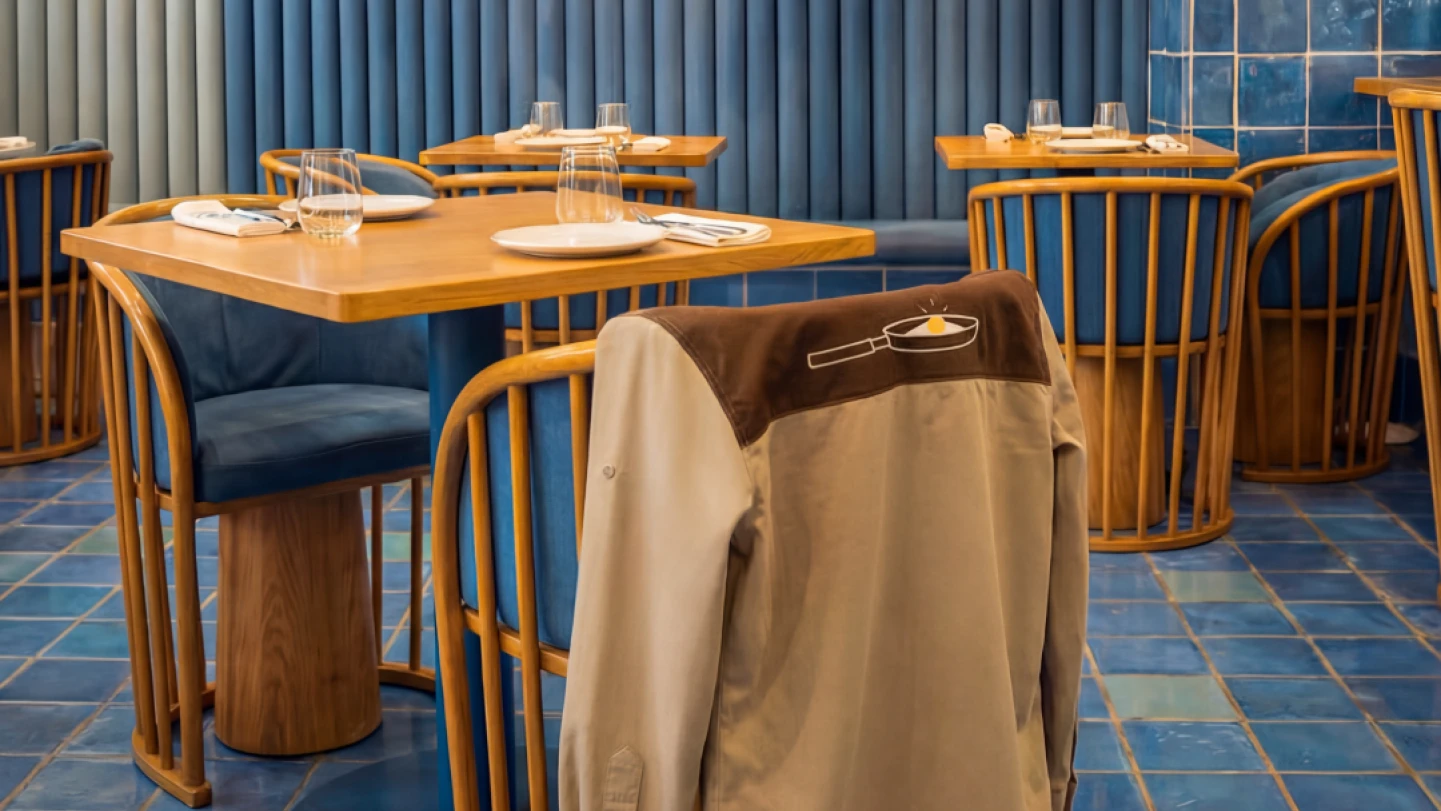Los botones en color amarillo, inspirados en la yema del huevo, aportan un guiño directo al mundo gastronómico, introduciendo un punto de contraste que conecta con el universo culinario de forma sutil y reconocible.