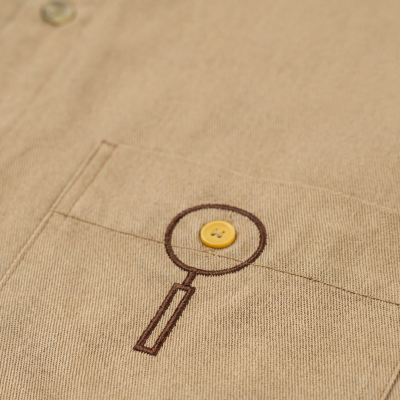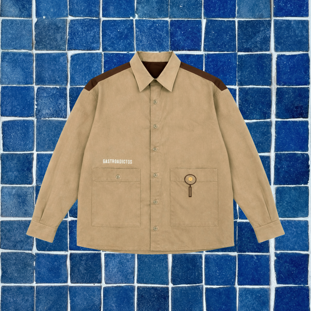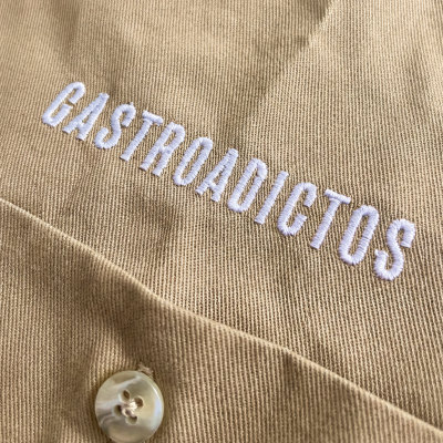 La sobrecamisa incorpora distintos puntos de personalización que integran la marca de forma sutil. Los bordados se distribuyen estratégicamente —delantero, bolsillo, canesú y recoge mangas— reforzando la presencia de Gastroadictos sin saturar la prenda.