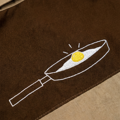 Uno de los elementos más representativos es la sartén, símbolo del grupo, que aparece como hilo conductor en los distintos detalles. Destaca especialmente su presencia en la espalda, así como su integración en elementos más pequeños, como el bordado alrededor del ojal.