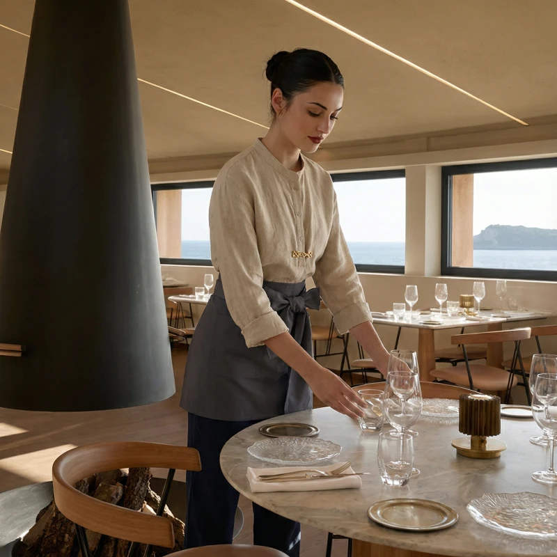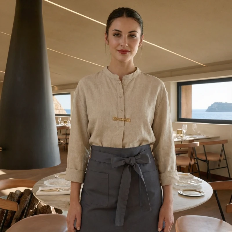El diseño incorpora detalles inspirados en la cultura local - acabados dorados, y cierres decorativos - junto a tejidos nobles que evocan el lino, seleccionados específicamente para garantizar durabilidad y facilidad de uso en el día a día. Para los equipos de restauración, se introduce un delantal pareo que aporta cercanía y refuerza la experiencia del servicio.